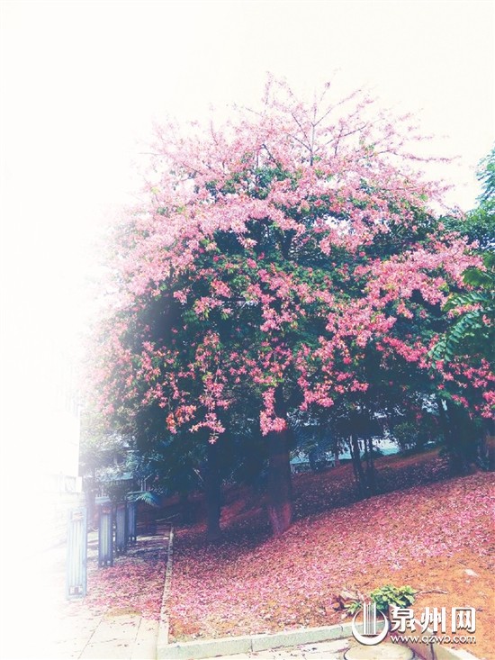 紫荆花花期集中在11月至次年4月。艳丽的紫荆花点缀在校园,暗香涌动,花瓣随风飘落,成为校园一道靓丽的风景线。