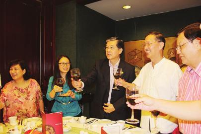 欢迎宴上,邓仲绵和校友会校友们举杯欢迎访问团的到来