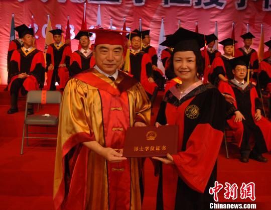 29日,国立华侨大学举行2013届毕业典礼暨学位授予仪式。华侨大学校长贾益民(左)向毕业生授予学位证书。 陈龙山 摄