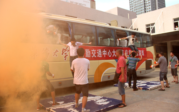 “砰、砰、砰…”几声巨响,车窗玻璃瞬间“分崩离析”,乘客纷纷从车窗成功逃生。这不是电视剧的场景,也不是事故现场,而是我校后勤交通服务中心正在进行的大客车应急疏散演练。