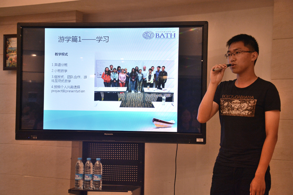 在分享环节,黄智对巴斯大学和暑期交流项目进行了简要介绍,着重分享他的游学经历以及对英国启发式互动式小班教学的独特体验。曹宇航用英文PPT述了在美国生活学习的点滴,用active、independent、tolerant、confident四个英文单词总结了在美国的留学经历,并以此鼓励学弟学妹学会主动、自立、包容、自信。徐涌菲分享了他两次到台湾交换学习的经历,把“明确目标”“勤奋踏实”“把握青春”三个词送给有留学交流意愿的同学。