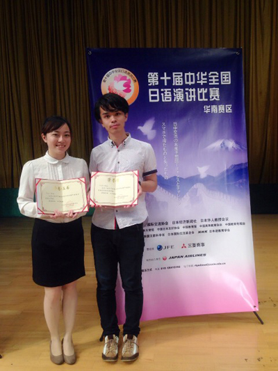 “第十届中华全国日语演讲比赛(华南赛区)”5月24日在广东外语外贸大学举行。我校选派的外国语学院日语系2012级学生李阳子获得二等奖,日籍教师今悠恭获得“优秀指导教师奖”。