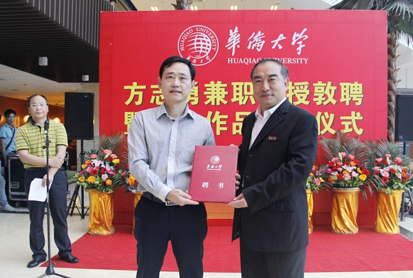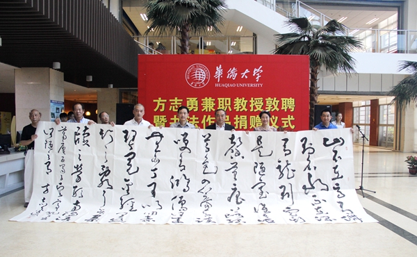 敦聘暨书法作品捐赠仪式在厦门校区郑年锦图书馆举行,校长贾益民为方志勇颁发兼职教授聘书并代表学校接受捐赠。校党委副书记朱琦环在仪式上致辞,代表学校欢迎方志勇加盟华侨大学。