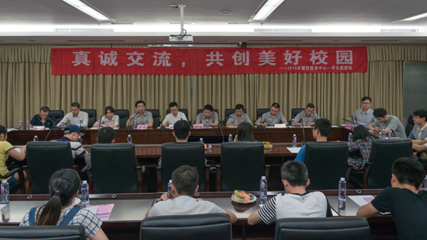 4月28日下午,后勤餐饮服务中心联合校学生会维权部在厦门校A403会议室召开2015年餐饮服务学生座谈会。后勤党委书记许国玺,后勤处、学生处、餐饮服务中心相关工作人员,各餐厅经理以及各学院学生代表40余人参加会议。