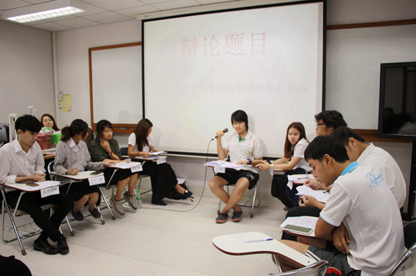 农业大学人文学院中文系学生以婚姻和爱情为主题讨论了一个备受关注的社会问题:对今天的泰国年轻人来说婚前同居是否必要。选手们从社会道德、家庭伦理、宗教、个人利益等各个方面挖掘论据,深刻讨论了婚前同居在当今泰国社会中对青年人产生的影响。