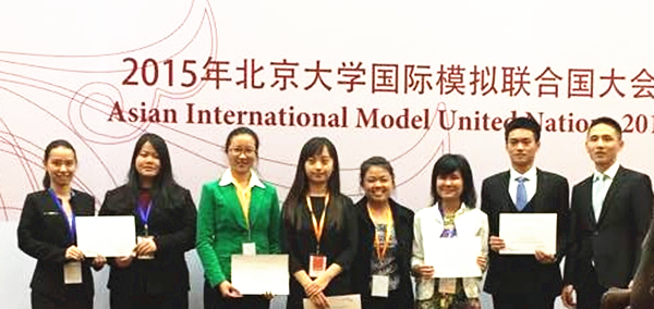 2015年北京大学国际模拟联合国大会(AIMUN)日前举行,我校模拟联合国协会推选了外国语学院林菁颖、工商管理学院陆思敏和公共管理学院余书勤3名同学参加,分别代表联合国基金委员会和联合国环境署出席会议。经过为期4天“合纵、连横”的辛苦磋商,林菁颖、陆思敏荣获最佳代表奖。