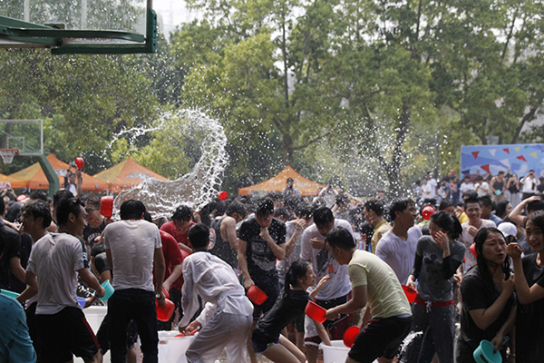 人们拿着事先准备好的水枪、脸盆、装满水的气球见人就泼,不管认不认识的碰上了就是一盆水劈头盖脸浇下去,更有巨大的水管不时进行全方位“人工降雨”。巨大的欢呼声、歌声、尖叫声响成一片,这便是华侨大学一年一度的泼水节的活动现场。