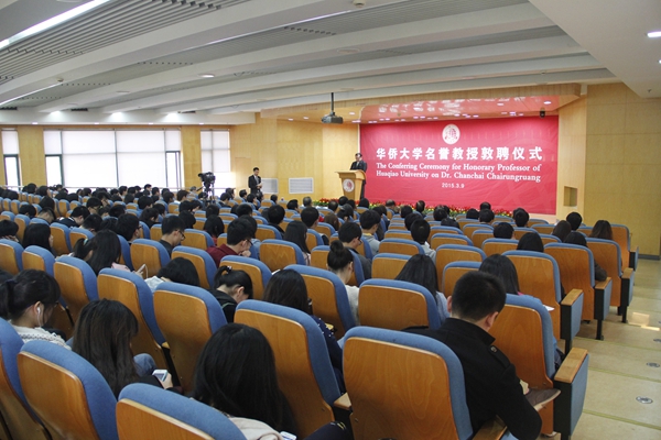 聘任仪式当天下午在华大厦门校区举行,泰中文化经济协会会长颇欣及夫人娜塔雅,泰中文化经济协会顾问、华大名誉教授尼空等出席敦聘仪式。华侨大学副校长曾路主持敦聘仪式。