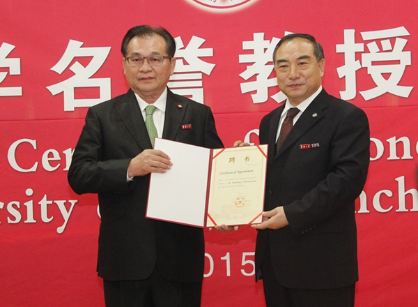 泰中文化经济协会副会长、泰国曼谷吞武里大学董事局主席参猜博士3月9日下午受聘华侨大学名誉教授,华侨大学校长贾益民为其颁发聘书并佩戴校徽。