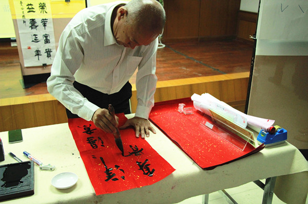 在学习了对联文化之后,贾庆带来了自己今年过年时书写的两幅楹联:“寒松俊雅,碧草清幽”和“周铜鼎铭荣华富贵,汉瓦当刻益寿延年”,赠送给农业大学孔子学院,希望农业大学孔子学院在传播中华文化的道路上不停探索创新,越做越好。贾庆还现场书写对联赠送给在场观众。