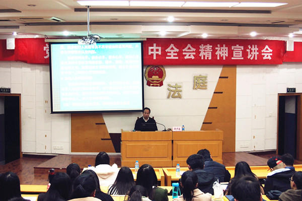 12月25日晚,法学院学习贯彻党的十八届四中全会精神研究生专场宣讲会在祖杭楼2-7教室举行。校学习贯彻党的十八届四中全会精神宣讲团成员、法学院院长许少波教授应邀作主题为“全面推进依法治国的理论逻辑”的宣讲报告,对十八届四中全会精神进行了解读。法学院全体研究生听取了本次讲座。