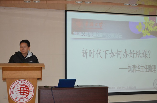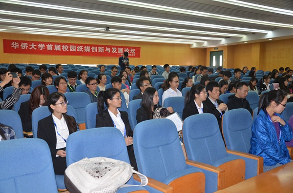 11月15日,由我校研究生会主办的“首届校园纸媒创新与发展论坛”在王源兴国际会议中心201厅举办。校社会科学研究处负责人杨楹,校党委宣传部副部长、《华侨大学报》主编赵小波,《海西晨报》采访部副主任、首席记者刘清华作为特邀主讲嘉宾出席了本次论坛。我校部分纸媒的指导教师以及来自厦门大学、集美大学和我校泉厦两校区的校园纸媒代表共70余人参加了本次论坛。