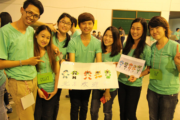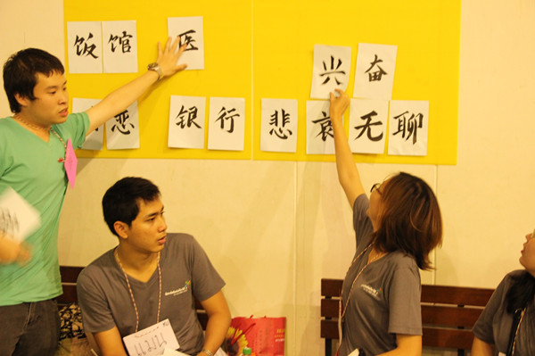 中文营上,来自四所大学的学生分成五组,分别以时间顺序参加不同的游戏环节。法政大学、商会大学、正大管理学院、农业大学以及农大孔院分别准备了东盟知识提问、中文传话、中文bingo游戏、中文词语对对碰和面塑比赛等五项竞技活动。其中,东盟知识提问是针对东南亚国家的首都、国旗等进行提问。中文传话游戏则是小组成员依次传递一句悄悄话,最后比较这句话的完整性。中文bingo游戏则是将同一类别的中文词语填入方格中,首先将词语填成一横行、竖行或者斜行的小组即获胜。中文词语对对碰是在小组成员背面贴上一个词语的不同汉字,例如厨房,分别在两个人背后贴上“厨”和“房”,看小组成员能在多长时间找到彼此的搭档。面塑比赛是孔子学院准备的环节,参赛成员需要按照预先给定的图片制作具有中国特色的物品,例如山水、福娃、京剧脸谱等,并给作品取一个中国名字。