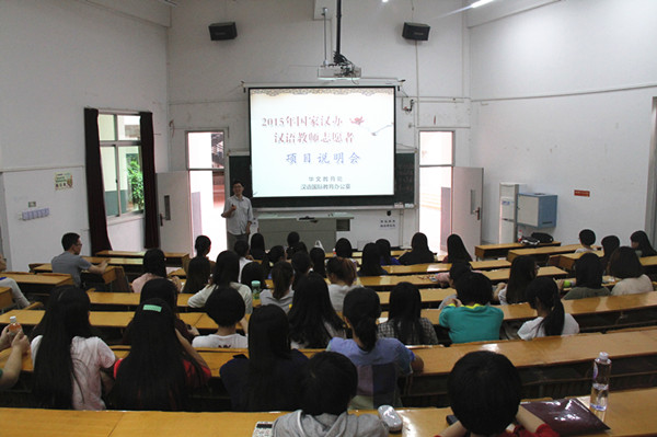 在项目说明会上,汉语国际教育办公室相关工作人员详细介绍了2015年国家汉办汉语教师志愿者的岗位信息、报名条件、报名流程,及我校与外方合作的泰国农业大学孔子学院、缅甸福星语言与电脑学苑孔子课堂的具体情况,并邀请往届归国志愿者参与互动,回答预报名同学关心的海外生活教学等问题。