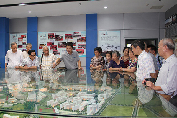 在68届校友联络人杨锡源校友的介绍下,陈捷一一与返校校友问好寒暄,并陪同校友们参观位于行政研发大楼一楼的校园规划与建设模型室,介绍学校及学院概况,登临二十五楼俯瞰校园及周边环境,并走访土木工程学院。
