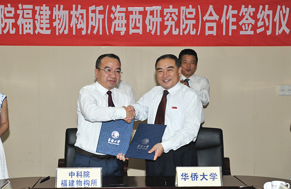 华侨大学校长贾益民和中国科学院福建物质结构研究所所长曹荣分别代表双方在战略合作框架协议、联合培养研究生协议、科研合作框架协议和装备制造科研合作框架协议上签字。