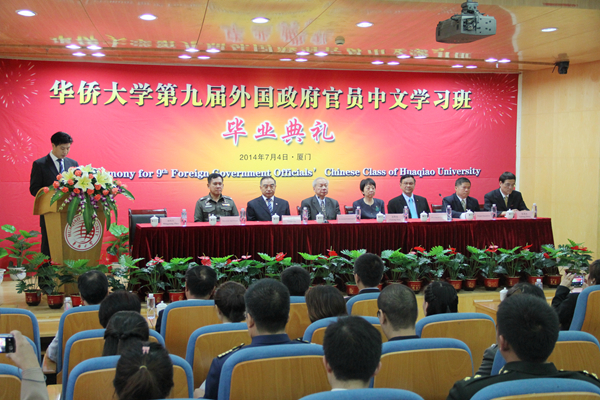 主席台嘉宾为华侨大学第九届外国政府官员中文学习班学员颁发结业证书