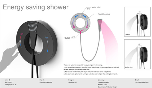 Energy Saving Shower(节能淋浴器)是一款立足于节能和节水的淋浴系统。IF概念设计奖组委会表示,该作品获奖主要有两个层面的原因:一是在理念层,紧扣节能、节水的可持续设计理念,这是全世界范围都非常关注和重视的议题;二是在设计层,在进行深入的用户研究基础上,提出了手指滑动设置水温水量,花洒的拿起即出水、放下即关闭等有效而简单的交互方式。