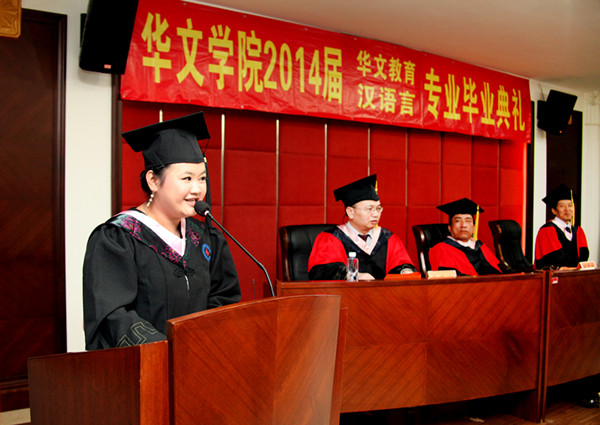 来自印尼的汉语言专业留学生王佳淑和来自缅甸的华文教育专业留学生陈桂菁代表毕业生发表毕业感言。他们回顾了在华文学院学习和生活的点滴,抒发了对华文学院的不舍之情,表达了对父母、对母校和老师的无限感激之情,表示将不辜负母校和老师们的期待,继续努力学习和传播中华语言文化。
