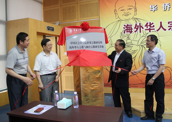 卓新平(左二)、林致知(左一)、贾益民、张禹东为研究基地揭牌