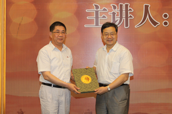 泉州市人大常委会主任陈海基向卓新平颁授“华大讲堂”主讲嘉宾纪念牌,华侨大学党委书记关一凡向其赠送学校纪念邮册。