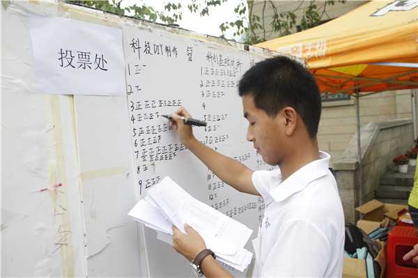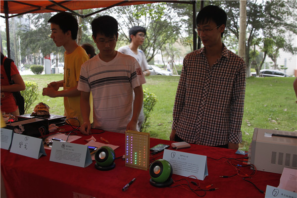 5月27日下午,工学院举办第四届“光微”科技文化节作品展暨大众评审会。在工学院门口,各种新奇的小玩意儿引得同学纷纷驻足观看,展览的同学热情高涨,不遗余力地向欣赏作品的同学讲解作品特点和制作原理。当然,他们希望得到的还有大众评审的选票。