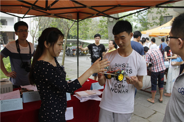活动热闹的场面也让受邀前来的校党委书记关一凡和副校长吴季怀十分感兴趣,两人一一询问和了解作品,并对学生科创精神和能力表示肯定。吴季怀说:“科技节平台很好,很不错,同学们的热情很高,动手能力也很强。这个平台要继续做下去,吸引更多的同学到第二课堂中来。”他还寄语大学生,“希望在更高级的赛事上看到你们的成绩”。