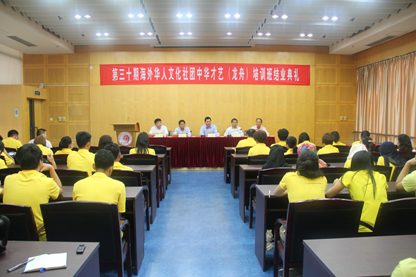海外华人文化社团中华才艺(龙舟)培训班由国务院侨办和中国海外交流协会主办,国务院侨办宣传司、华侨大学承办。本期培训班主要内容包括龙舟技能培训、民族传统运动体验、水上技术等课程以及中华文化讲座和传统文化观摩等。