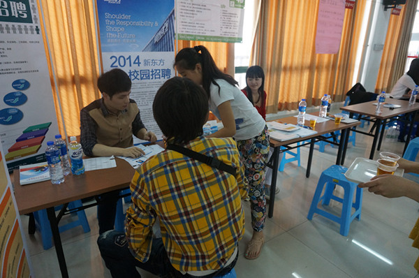 本次招聘会共吸引了新东方、博远教育、快乐学习等22家企业前来校园设点招聘,涉及教育、文化传媒、艺术、餐饮、软件、房地产、物流等多个行业共计400余岗位。2014届毕业生们纷纷来到各自感兴趣的公司前,就公司的发展前景、岗位需求等进行了解和沟通。