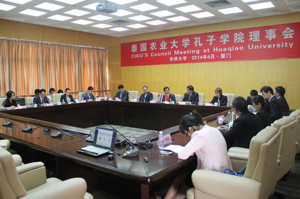 当日上午,第四届泰国农业大学孔子学院理事会在华侨大学厦门校区王源兴国际会议中心召开。会议回顾总结了孔子学院的工作,探讨未来新一轮的发展,并通过了新一届的理事会成员名单。