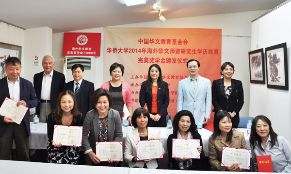 近日,华侨大学2014年海外华文教师研究生学历教育完美奖学金颁发仪式在日本东京举行。中华人民共和国驻日本国大使馆一等书记官兼领事王树凡先生,中国华文教育基金会项目二部主任李晓梅女士,华侨大学研究生院常务副院长王丽霞教授,全日本华侨华人联合会会长颜安先生,文培学院会长李文培先生等为获奖学生颁发证书。此次共有2名博士、9名硕士获得该项奖学金,奖励总额为74000元人民币。