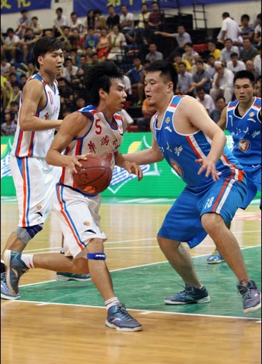 下半场比赛,吴德琳突破中投命中,侯勇强打内线造犯规,罚球线上2罚2中。两位各自大学的核心球员在场上展开激烈的PK。吴德琳强打内线得手,可惜加罚未能命中。刘振环中投命中,侯勇强打篮下造周鲁男犯规,罚球线上2罚2中,双方分差拉近到5分。