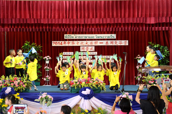 中国驻泰王国大使馆侨务参赞方文国,泰国华文教师公会主席罗宗正伉俪,泰国东方文化书院院长何韵及百余名家长共同观看闭营式汇报演出。