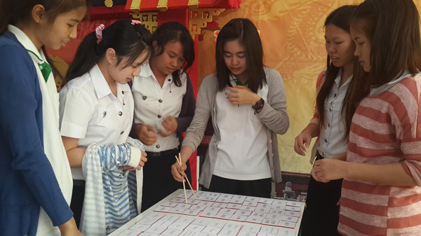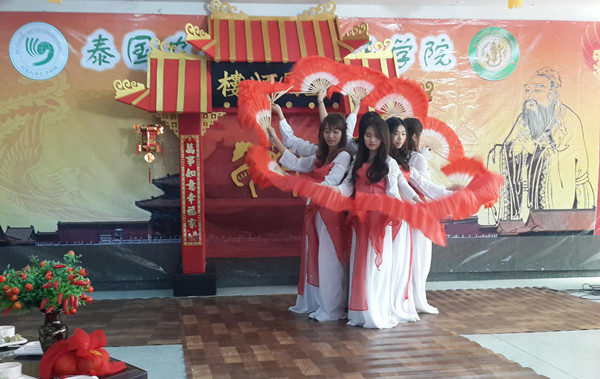 火红的灯笼、大红的中国结让整个会场欢乐祥和、喜气洋洋。农大孔院中文系的学生们精心准备精彩的节目,大一的学生带来优美的扇子舞、情歌对唱《一念之间》、高难度的《抖空竹》等节目,展示了泰国年轻一代对中国传统技艺的喜爱,为联欢会带来热闹的开场。大四学生带来《到碗里来》游戏,师生一起互动,共同将联欢会推向高潮。大二学生作为主办年级,为大家准备了热气腾腾的包子、饺子,大家一边品尝美食一边欣赏节目。晚会在气势雄浑的功夫扇《霍元甲》的表演中收尾,让大家回味无穷。