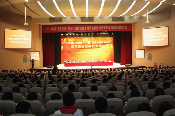 1月6日晚,2013年厦门各高校“三爱”主题教育系列活动阶段总结暨艺术精品进高校活动在集美大学诚毅学院举行,厦门市政协主席、市委教育工委书记陈修茂,副市长黄强等出席并为获得优秀组织奖的学校以及征文比赛获奖同学颁奖。我校200余名师生代表到场参加活动。