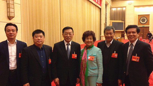 中国侨联主席林军(左三)会见出席侨代会的我校部分校董及校长助理彭霈(左二)
