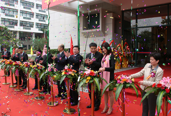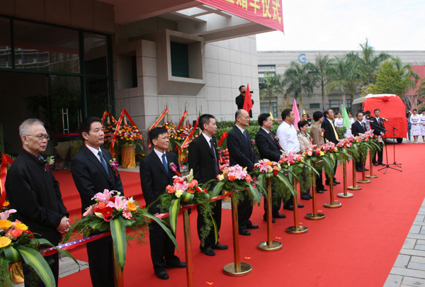 马儒沛,香港投资集团有限公司董事长、万川行政大楼捐资人张志猛、黄丽玉贤伉俪,赵阳,刘良辉,黄娇灵,李卫平,蔡冬梅,香港永隆集团有限公司董事长吴辉体,中国华商控股集团董事、全国侨联委员庄永兴共同为万川行政大楼落成剪彩。