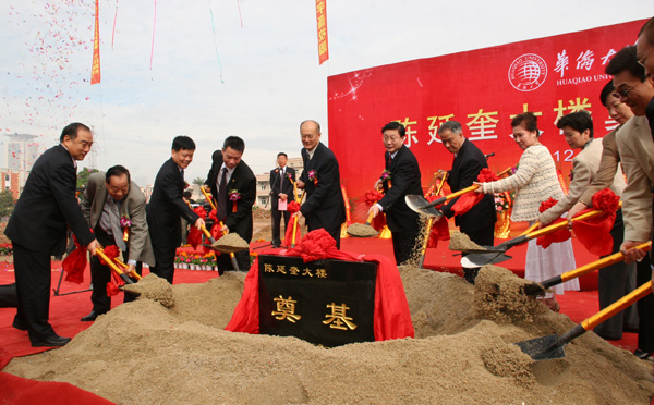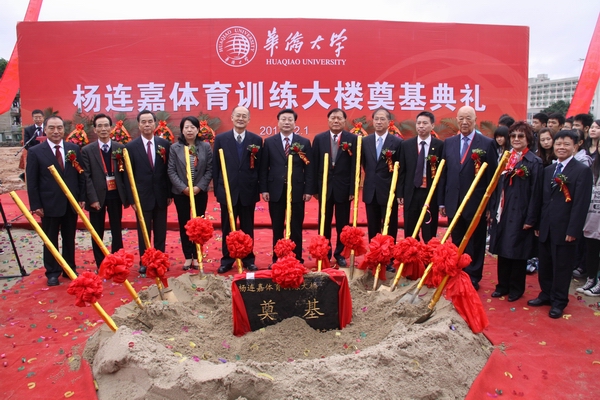 国务院侨办副主任马儒沛,中国海外交流协会副会长赵阳,香港中联办教育科技部部长潘永华,泉州市人民政府副市长周真平,福建省侨办副主任刘良辉,全国政协委员、香港南益实业集团有限公司董事长林树哲,华大董事会副董事长陈守仁、李碧葱、姚志胜,泉州市外事侨务办公室主任李卫平,校长贾益民以及捐资人徐伟福、杨连嘉等共同为徐伟福体育教学大楼、杨连嘉体育训练大楼培土奠基。