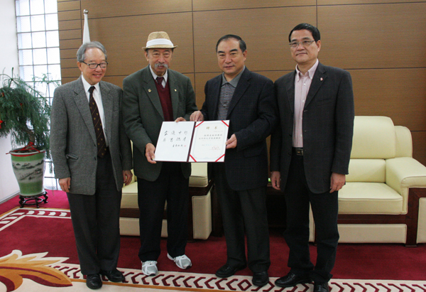 校长贾益民为麦继强(左二)颁发华侨大学客座教授聘书