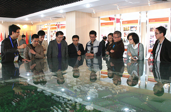 校史馆讲解员向黎大志书编撰人员介绍校区沙盘模型