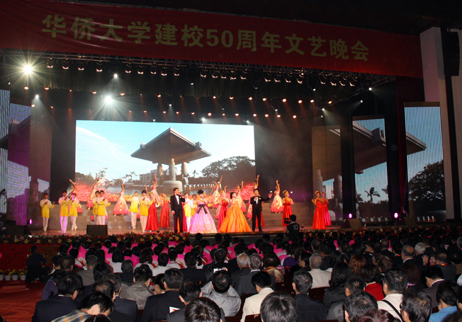 当晚的庆祝晚会分引子《四海同歌》,和“情定泉州湾”、“情满华园路”、“硕果满枝头”三个篇章及尾声《远航》等几个部分,大气热烈,场面壮阔,情意绵绵,意蕴深长,艺术地再现了华侨大学从创办、复办到今日全面发展的五十年历史画卷,讲述了几代华大人艰苦创业、卓绝奋斗的心路历程,展现了华侨大学与“侨”深深相吸的“依依侨情”,呈现了华侨大学所走过的五十年“春华秋实”的金色历程。