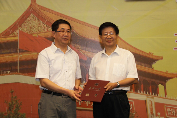 校党委副书记、副校长关一凡向李君如(右)颁授华侨大学名誉教授聘书