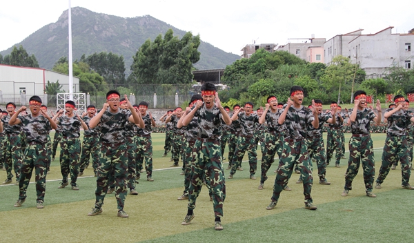 随后,军训团进行了汇报表演,集中展示了军训团9天以来的训练成果。战术操表演中,钢铁战士们手持钢枪,匍匐前行,穿过“硝烟四起”的战场,攻陷敌营;队列展示的女兵方阵,动作迅速敏捷、整齐划一;匕首操表演方阵,展示了精湛熟练的匕首操,厮杀声响彻田径场;旗语表演方阵,手握红色和绿色旗帜,用旗语展示了数字“1”、“2”、“3”和“会通中外、并育德才”拼音的首个字母;喊声阵阵的格斗术表演,展现了华大男儿的阳刚之气;热闹非凡的拉歌表演,展现了华大女兵的独特风采。整个汇报表演精彩纷呈,鼓掌声、喝彩声此起彼伏。他们的汇报表演代表全体新生为大学“第一课”交上了一份令人满意的答卷。