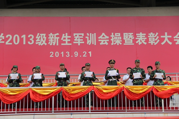 9月21日,华侨大学2013级新生军训结束。当日下午,华侨大学2013级新生军训汇报表演暨表彰大会在泉州、厦门两校区举行。校领导朱琦环、吴季怀,承训部队领导及教官,各职能部门、各学院负责人出席表彰大会。