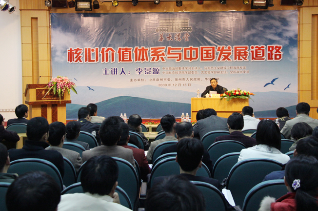 由泉州市委市政府和华侨大学共同主办的高端学术品牌“华大讲堂”,十八日下午迎来第九场,也是今年最后一场讲座。全国政协委员、中央政治局集体学习主讲人、全国马克思主义理论研究和建设工程哲学组首席专家、中国社会科学院学部委员、文史哲学部副主任李景源教授受邀作《核心价值体系与中国发展道路》主题报告。
