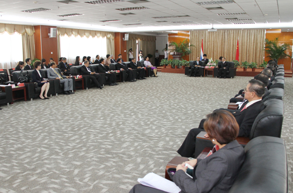 贾益民代表学校欢迎尼空议长带领泰国政界、商界及军界精英访问华侨大学,并向尼空议长一行介绍了学校的基本情况。
