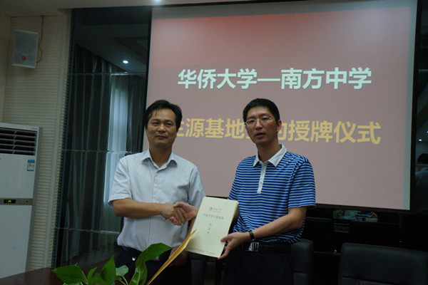 27日,华侨大学一行四人分别走访了株洲市南方中学、株洲市第二中学,与学校负责人及教师代表座谈交流。陈捷代表华侨大学分别向两所中学校长颁授了“华侨大学生源基地”牌匾,并签订生源基地建设协议。