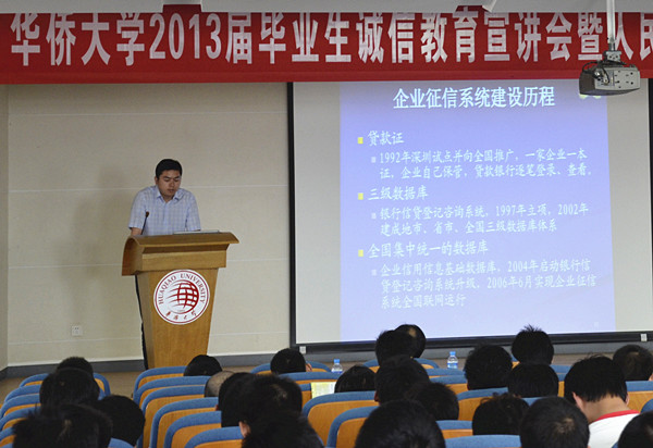5月10日下午,2013届毕业生诚信教育宣讲会暨人民银行征信管理条例知识讲座在厦门校区王源兴国际会议中心101报告厅举行。中国人民银行厦门中心支行陈澍担任主讲嘉宾,中国银行厦门分行个贷中心督导赵林、中国银行厦门华大支行行长杜国育及我校学生处副处长高炳亮等出席。厦门校区近300名获贷毕业生参加讲座,并办理毕业生还款确认手续。