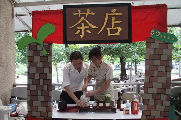 会场的一角,还有一个新颖别致的展台吸引了很多师生,这是同学们自己开的“茶店”。他们在这里表演中国茶艺,为各位观众送上一杯清新可口的中国茶。不少观众一边品尝着月饼,一边喝着清茶,甚是惬意。