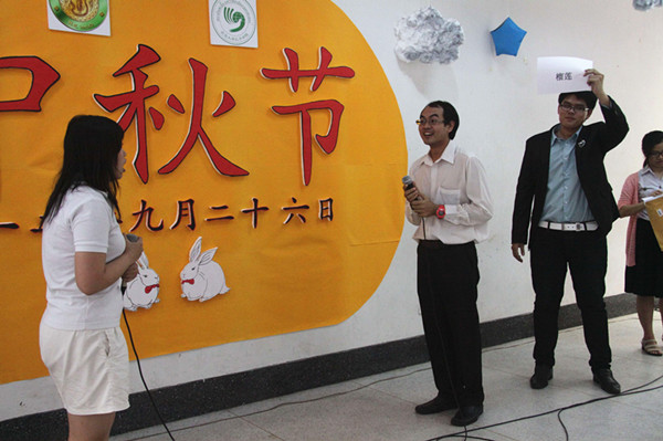 学生的积极性都很高。他们制作了精美的中秋知识展板,将嫦娥奔月、中秋赏月等佳话,图文并茂地展现出来。节目中还穿插了互动环节——中文猜字游戏和中秋知识抢答。在猜字游戏中,诸如“飞上天”、“月饼”、“团圆”这类词语,学生们都能通过所学汉语知识结合肢体语言,演绎得栩栩如生,气氛十分活跃。知识抢答更是使整场活动达到高潮,竞答题涉及中秋节的方方面面,许多同学都争先恐后地举手抢答。